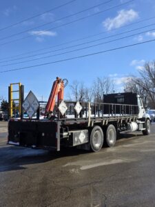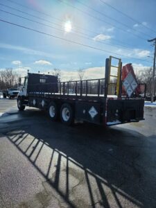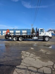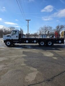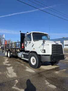 • Features: Block Heater, PTO, Lockers, L&R Power Windows, Power Locks, Rear Suspension Air Dump, Cruise Control, Power Mirrors w/ Heat, Engine Brake, 3.73 Gear Ratio, 252″ wb, 24′ Flatbed (can be removed)